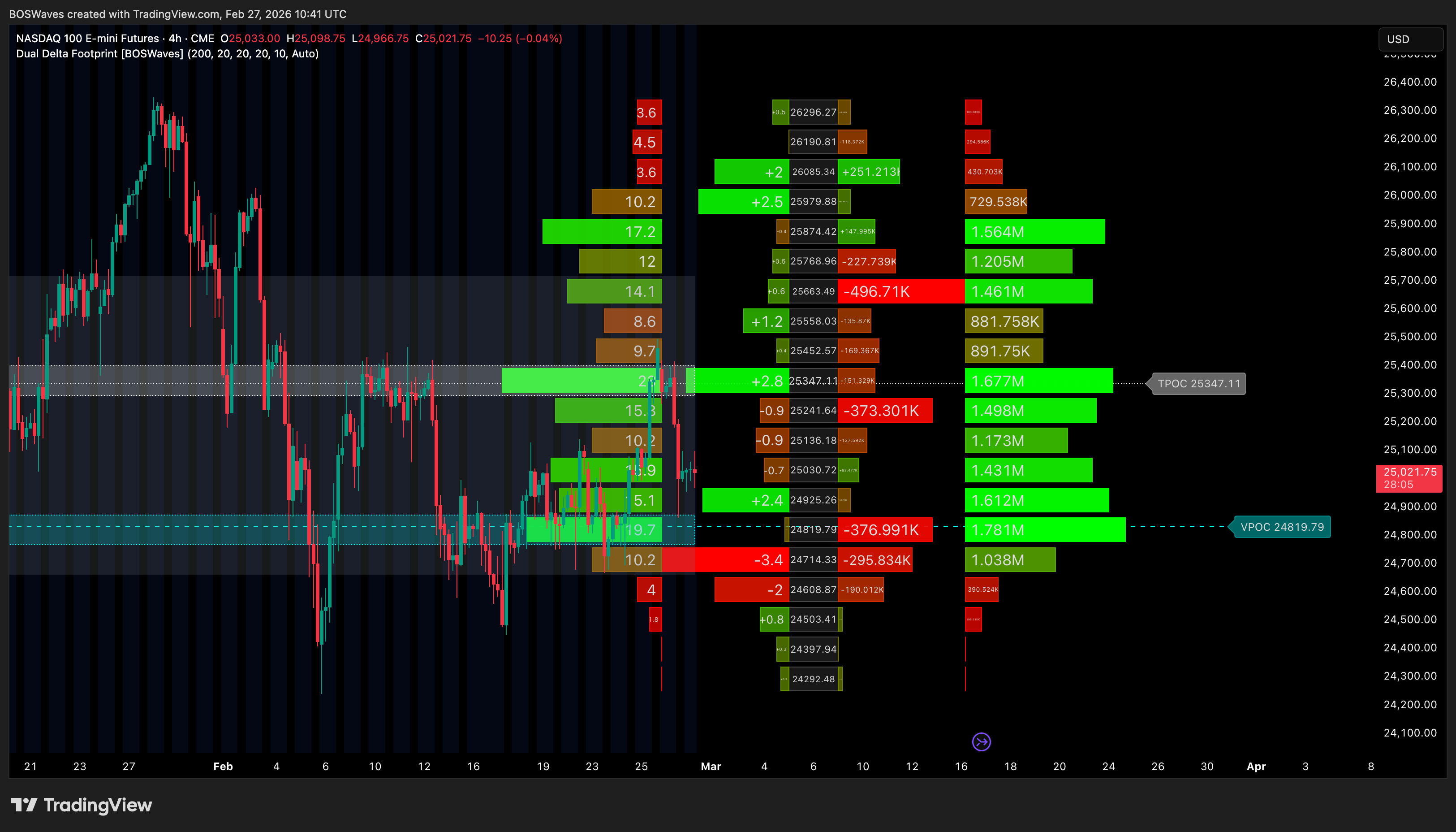 - Simultaneous time profile (TPO) and volume profile with directional delta decomposition